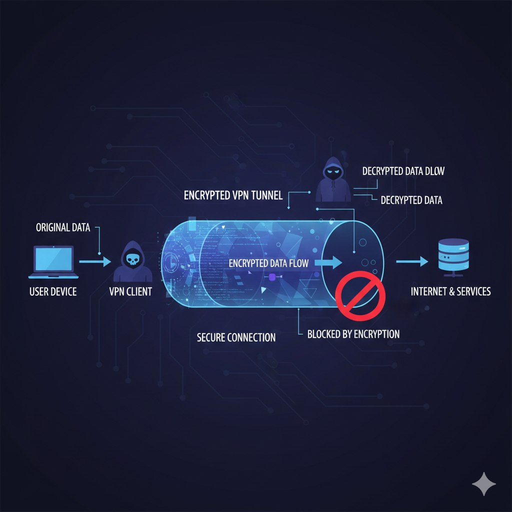 A Virtual Private Network (VPN) encrypts your internet traffic and hides your IP address. It creates a secure tunnel between your device and a remote server, protecting your data from hackers, ISPs, and surveillance.